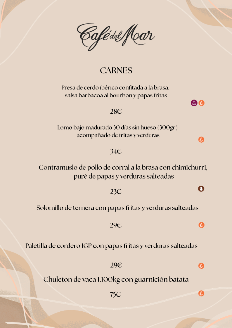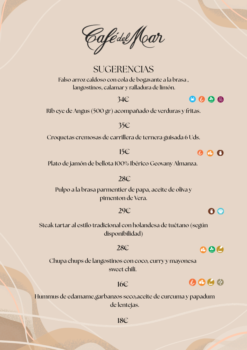 Food options include a mixture of starters, light bites, and main courses featuring items such as ceviche, grilled vegetables, salad with burrata, octopus prepared Galician style, beef carpaccio, and solomillo. Additionally, there are vegetarian-friendly options like hummus and a variety of sharable plates including chips and flatbread.